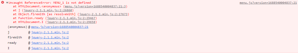 일단 위 에러 메시지를 보면 Uncaught ReferenceError: [MENU_1] is not defined 라고 나오는데, 이 문장을 번역하면 "잡히지 않은 참조 오류: MENU_1이 정의되지 않았습니다." 이다. 쉽게 말해 웹 브라우저가 '나 이거 못찾겠어..' 라고 보내는 신호라고 보면 된다.